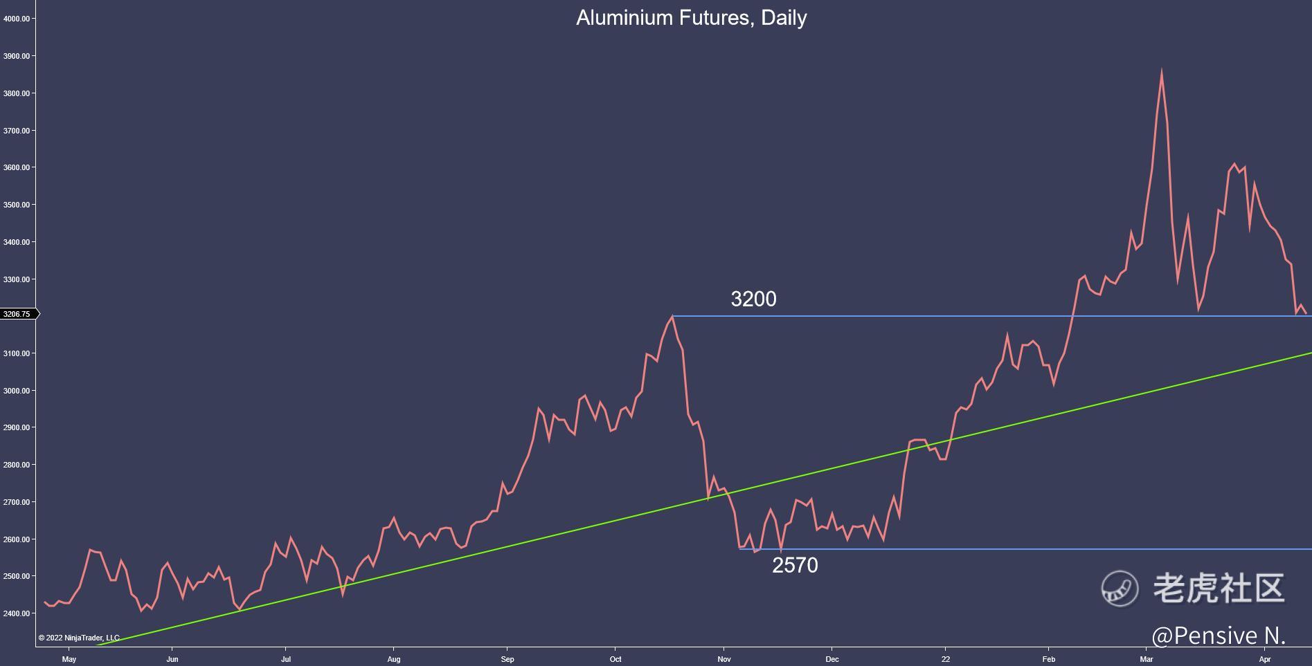 - Aluminium has fallen back to major support ~$3200, remaining in its period of consolidation