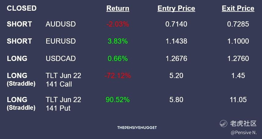 - Exited straddle on TLT in anticipation of long yields turning lower, for a net gain of 18.4%