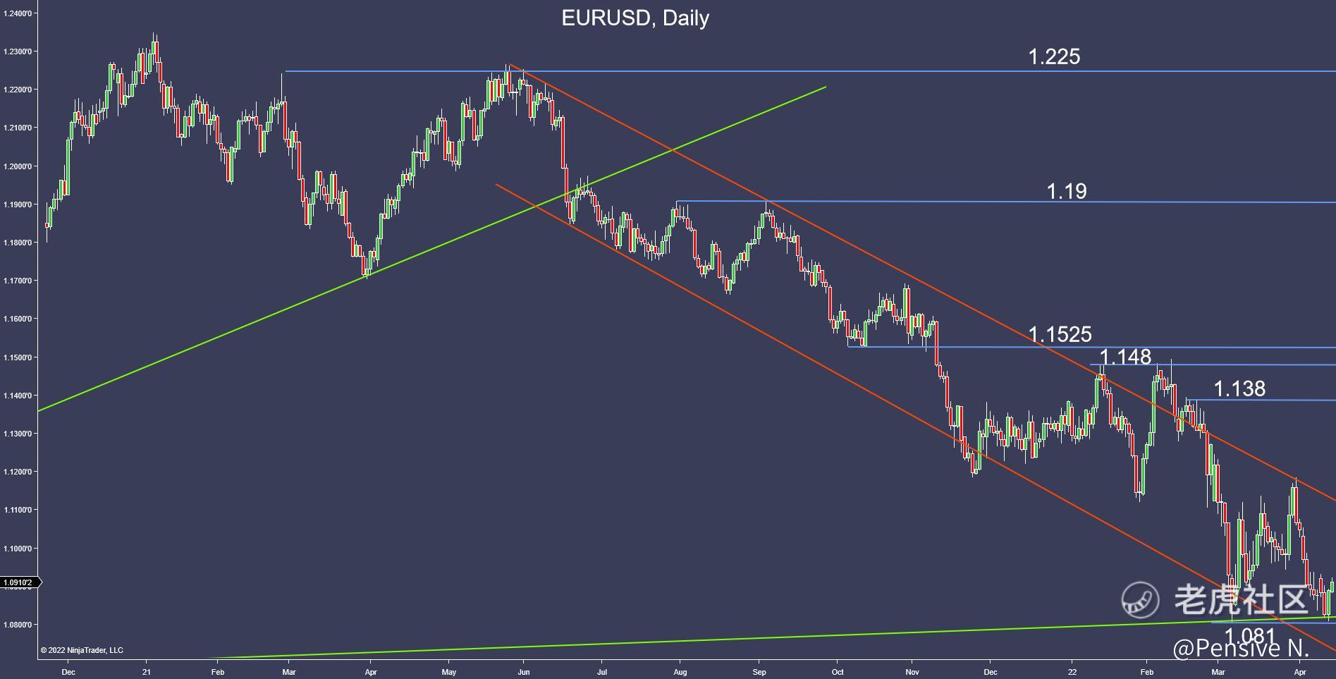 - The medium term trend is still bearish, with new lows likely, but it has to break below 1.081 first