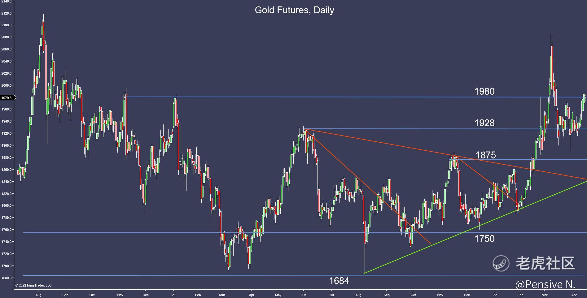 - Gold broke out of its tight range ~$1900 and is now testing resistance at $1980
