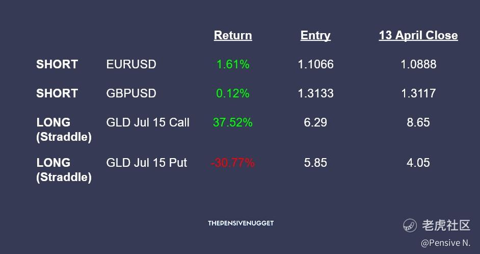 - Purchased a straddle on gold, using GLD options, to take advantage of gold trading in a tight range in the first week of April