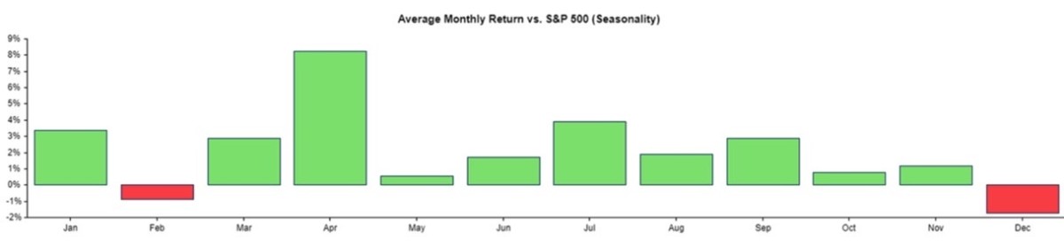 Still, from a seasonality perspective, Apple stock tends to produce its best few months of gains right around this time of the year. The chart below depicts return seasonality vs. the S&P 500. While February has historically been a bit weak for AAPL, March and April rank among some of the best months.