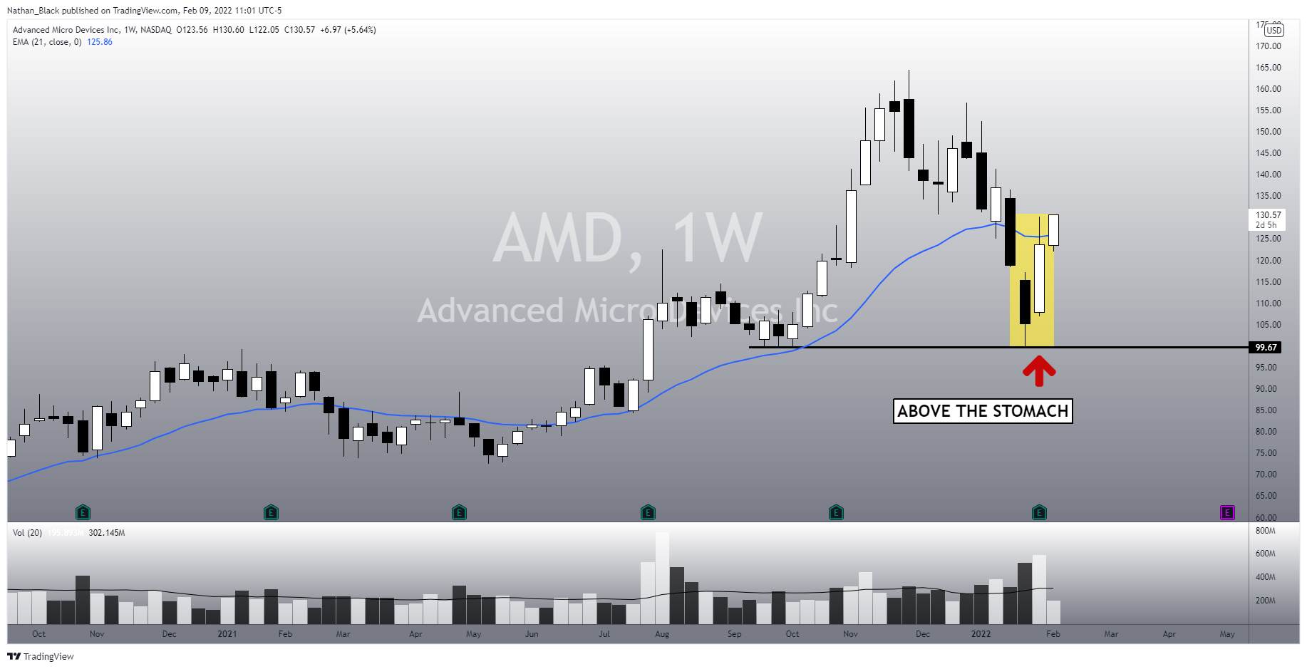 In the weekly chart, we see that the support at $ 99s is a very good one, and whenAMDretested it again two weeks ago, it bounced back up, and it did another bullish pattern, called Above the Stomach, which is a quite common pattern, but it seems few know it by its true name.
