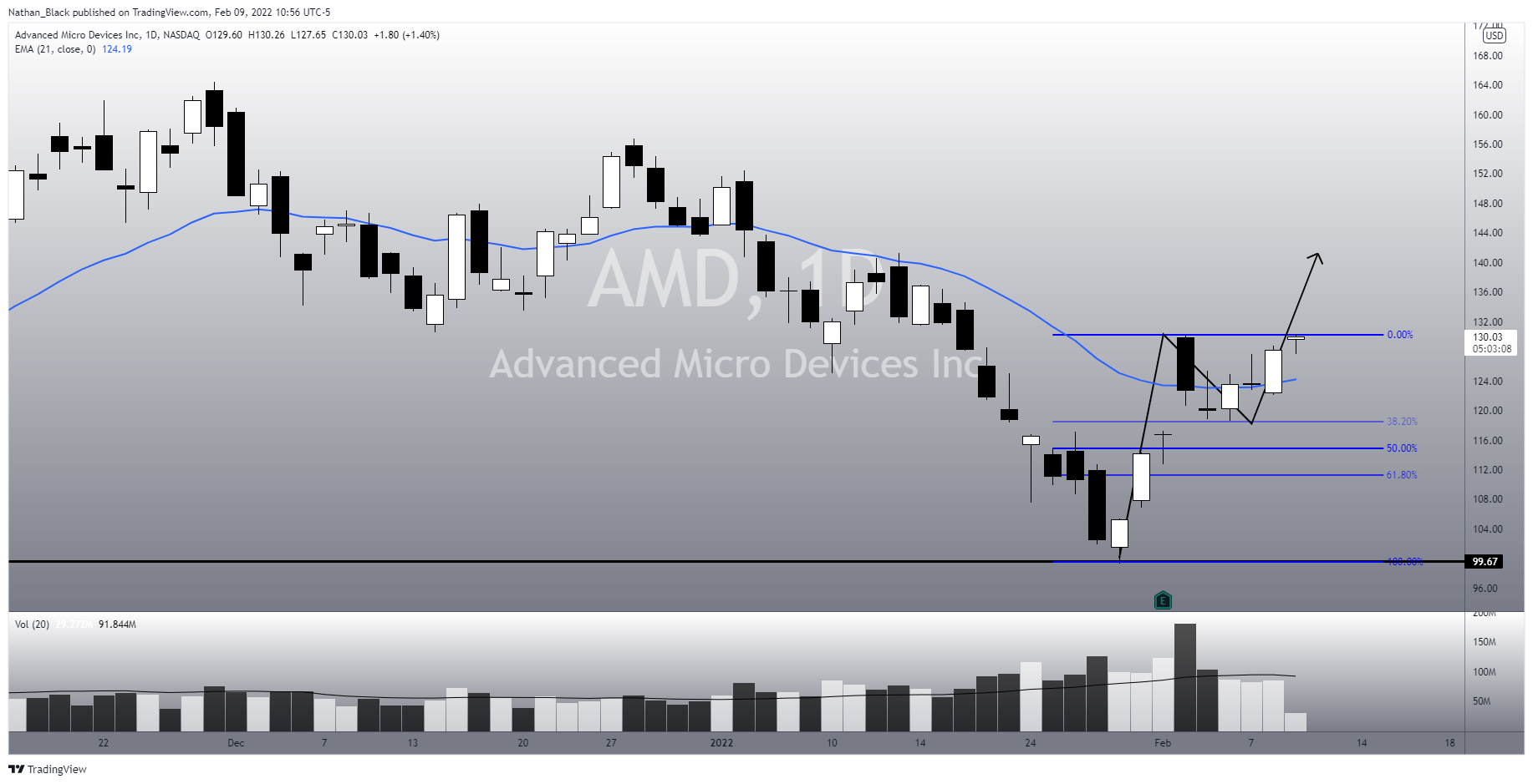 Now, we see that it is doing another chart pattern calledCup & Handle, another bullish chart pattern, and this reinforces the thesis on AMD for the short-term. Now, let’s see the daily chart for more clues: In the D chart,AMD is trying to trigger a bullish pivot, by doing a higher high/low for the first time since it started its downfall. Recently, the 38.2% Fibonacci’s Retracement worked as a very good support level, and it seems the price respected this point, and it officially did a higher low (higher than the previous bottom near $ 100).
