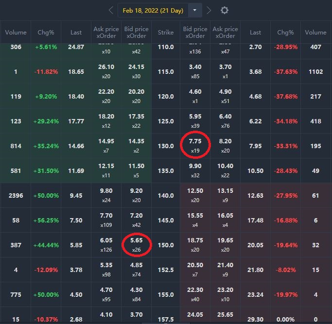 Looking at the screenshot above, the stock price is currently $136. Assuming I am bearish on the stock, I would want to have a PUT option with a strike price closer to the stock price than the CALL option. So in this example, I would buy a PUT option with strike price at $130 and CALL option with strike price at $150. The reason is because assuming the bearish thesis is correct and the stock price falls, it will be easier to be ITM if the strike price is closer to the stock price than if it is further from the stock price. However, the penalty is the higher premium I have to pay upfront. This has to be taken into account in order to compute the profit and loss.
