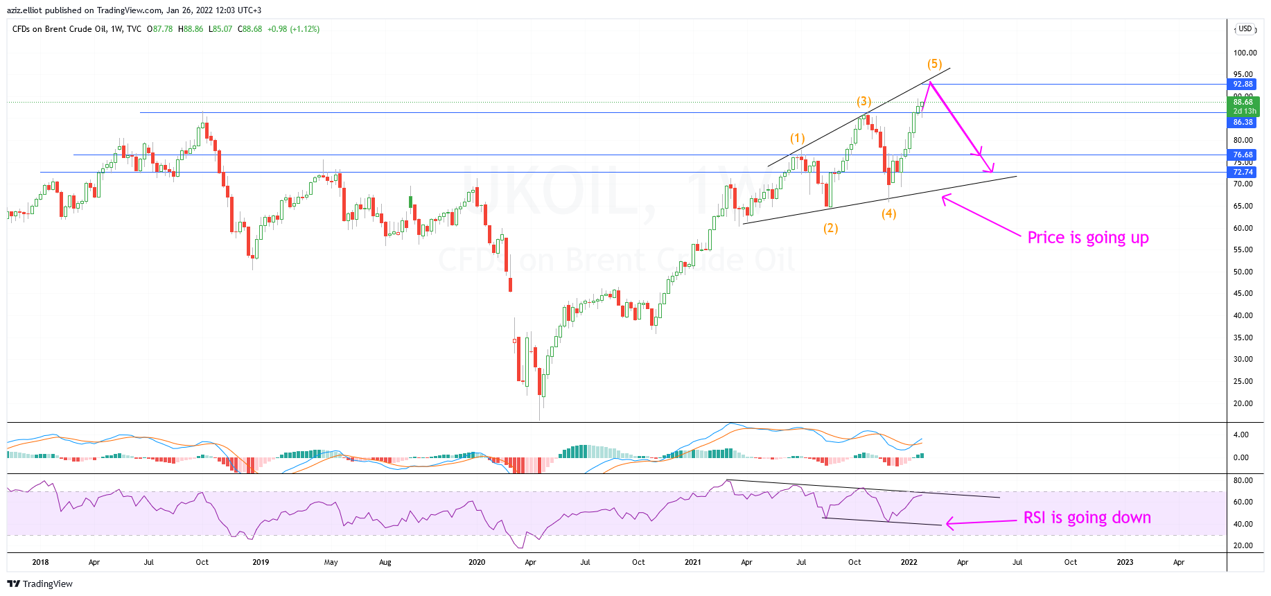 The same is noticed with RSI, which in technical analysis signals a steep correction ahead. Brent oil is completing a 5-wave move finishing the expanding diagonal formation.