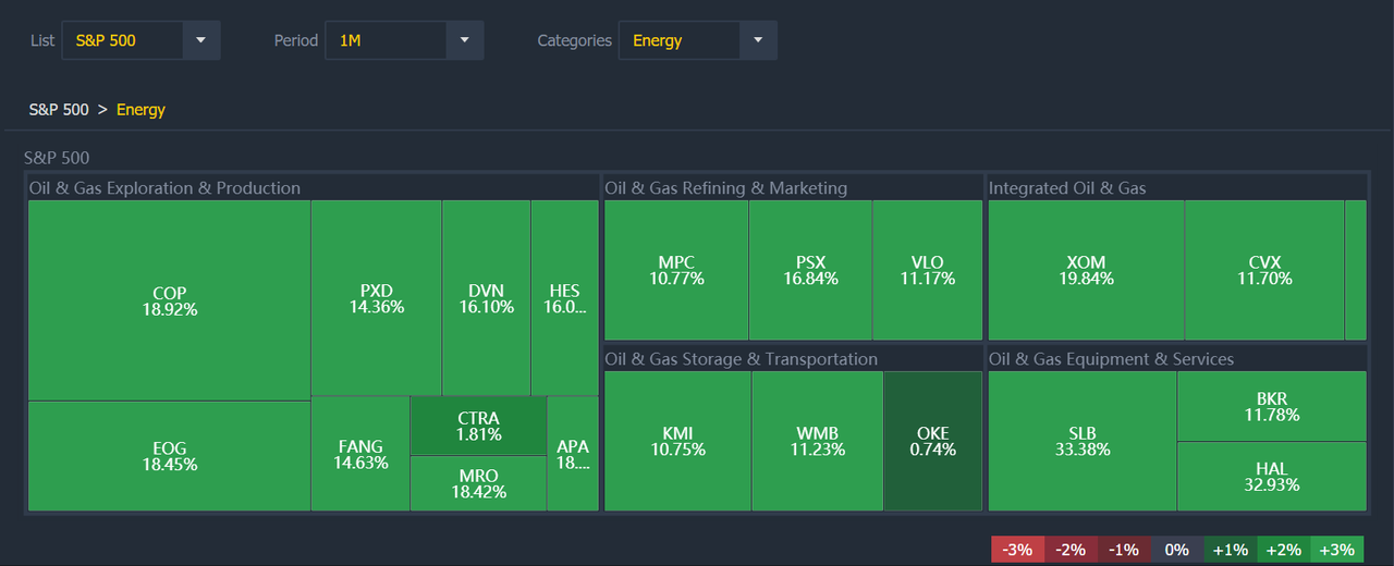 Looking at stocks, we can see in the last 1 month, the prices of stocks in the energy sector have seen uniform growth. SLB$Schlumberger(SLB)$ , HAL$Halliburton(HAL)$ have risen more than 30% in a month. COP$ConocoPhillips(COP)$ , EOG$EOG Resources(EOG)$ , MRO$Marathon(MRO)$ and XOM$Exxon Mobil(XOM)$ have risen near 20%.
