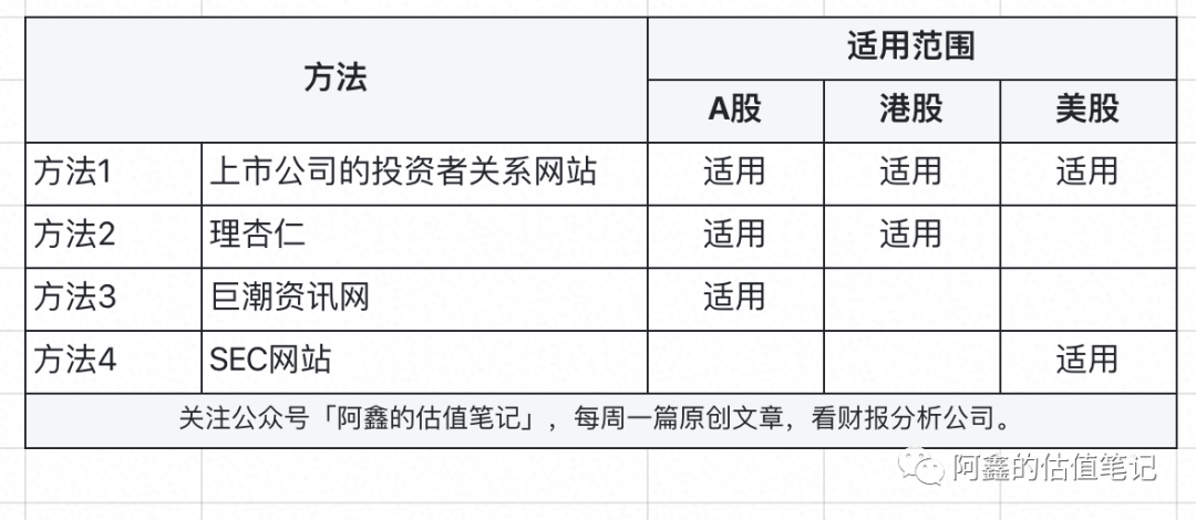 這個方法是我最常用的,除了財報,很多公司的投資者關係網站上還會提供一些額外的資料,比如:阿里巴巴會提供業績展示PPT,騰訊會提供excel版的業績數據,有贊會提供電話會議的會議紀要,十分值得探索。