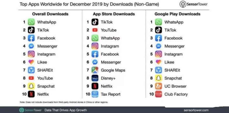 2019年12月全球非遊戲類手機App下載量榜單