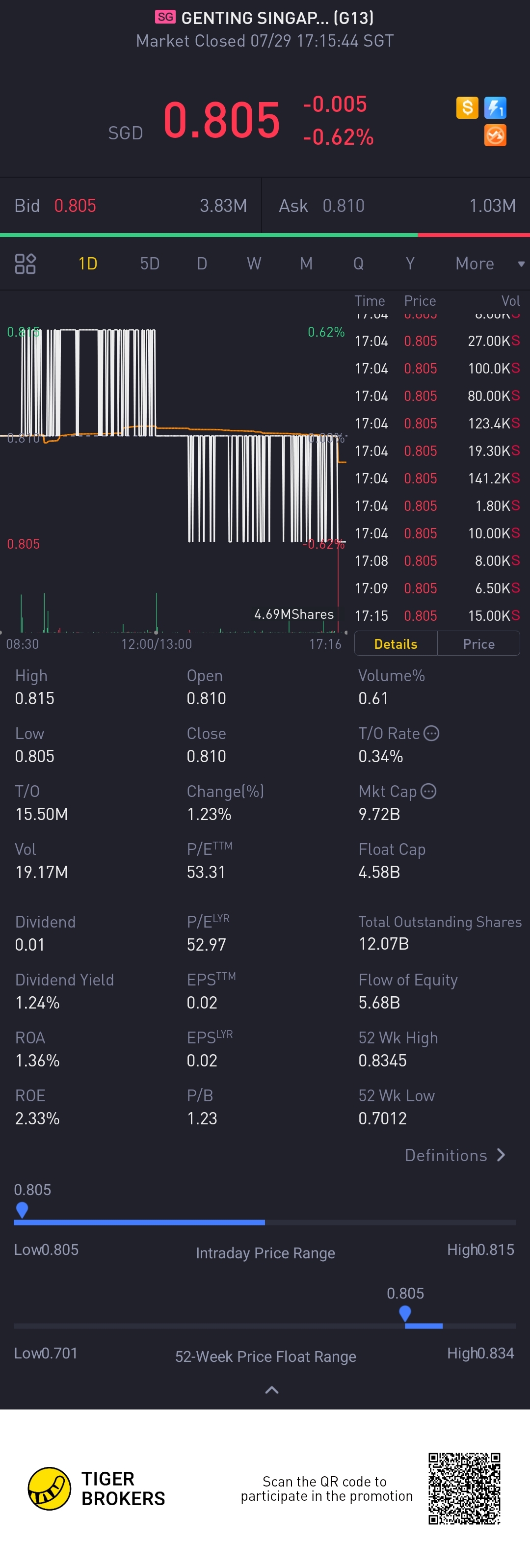 $GENTING SINGAPORE LIMITED(G13.SI)$12 days to results release. Will it be as exciting as $SINGAPORE AIRLINES LTD(C6L.SI)$ or will it show the same problem as $SATS LTD.(S58.SI)$? I am hoping for some good news but if that is the case then it means that SATS have taken some wrong choices along the way.