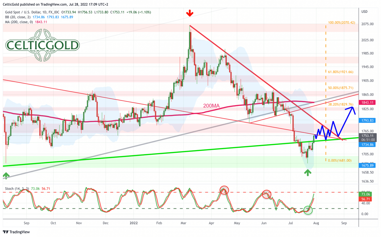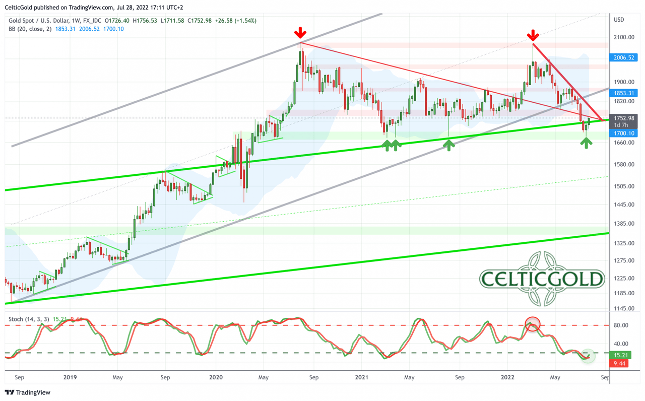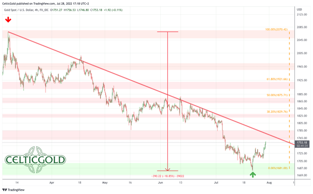 Gold prices reached an important high on March 8th, 2022, at around $2,070 USD and have since then slid into a brutal sell-off over the course of the last three and a half months. The final low of this wave down has been seen on Thursday, 21st of July, at $1,681 USD. Thus, gold has lost almost $400 USD or 18.8% in a rather short period of time.Besides the clearly overbought situation and the euphoric sentiment in March combined with the fact that precious metals are already within a correction since August 2020, the toxic mix of interest rate hikes & quantitative tightening of U.S. monetary policy, as well as high inflation data and collapsing stock & crypto markets, and thus a rampant recession, were primarily responsible for this selling pressure and the nasty downward spiral, which unfolded in the gold market. More and more investors plagued by the stock and crypto crash were thus forced to sell their physical precious metal holdings in order to access much needed liquidity.