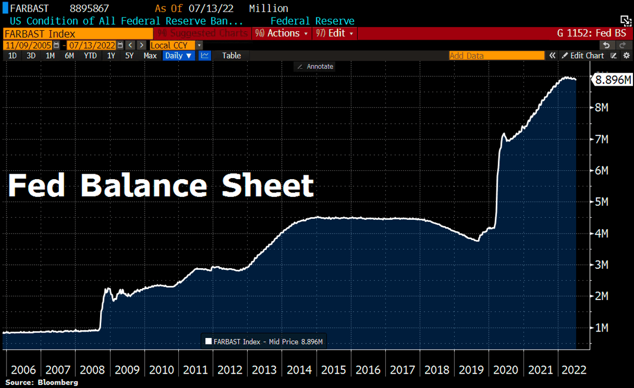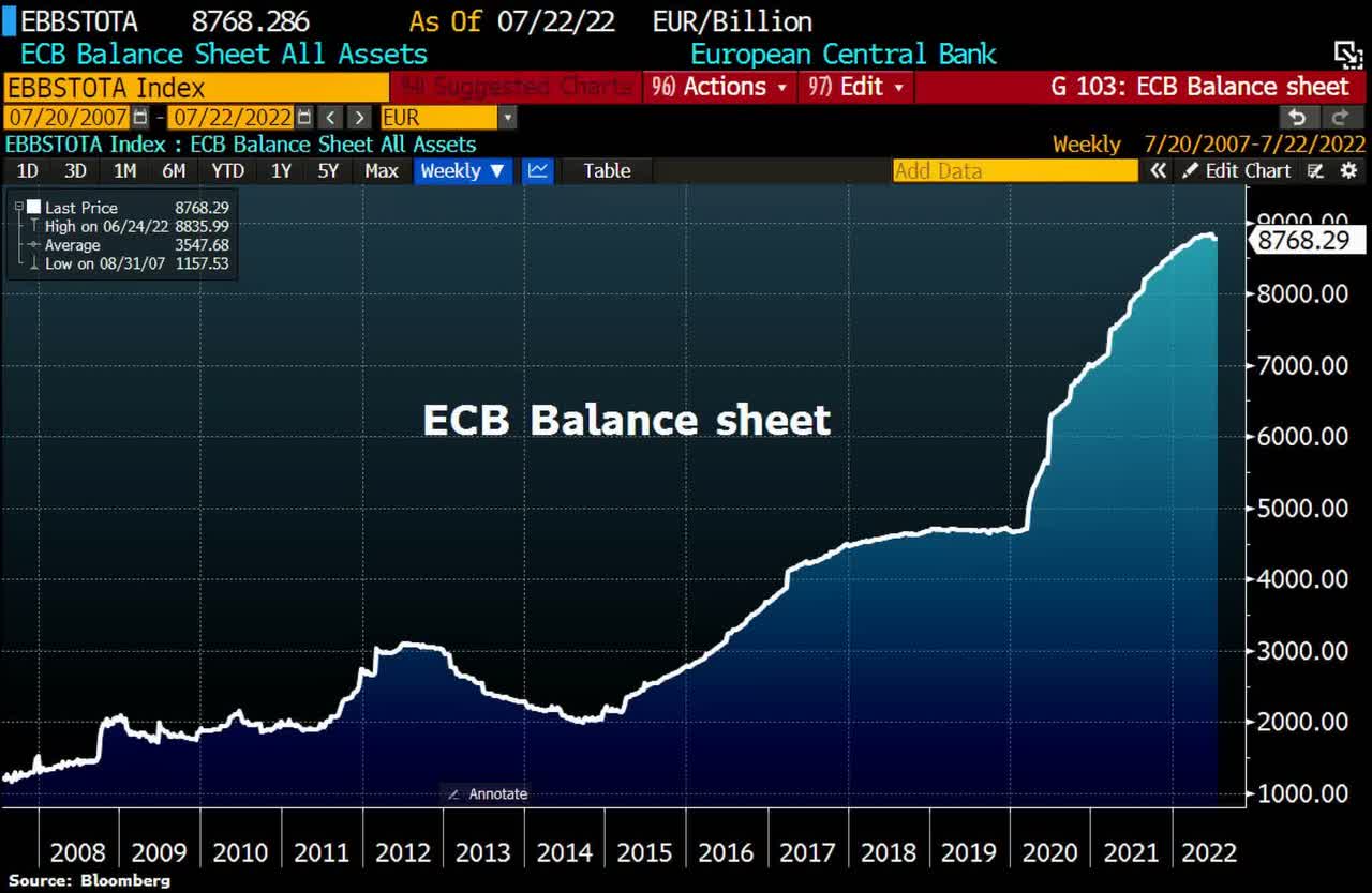 According to the official data released as of July 13th, the Fed has therefore already stopped shrinking its balance sheet again, as total assets increased by $4 billion USD to $8.896 billion USD as of July 13th. The Fed's balance sheet now represents 36.5% of U.S. GDP, compared to 82% for the ECB and 135% for the BoJ.And the ECB's balance sheet has also grown again recently after three weeks of contraction. Total assets rose by 2.6 billion EUR last week to 8,769.3 billion EUR. This means that the ECB balance sheet is still close to its all-time high and is now equivalent to 82% of eurozone GDP.