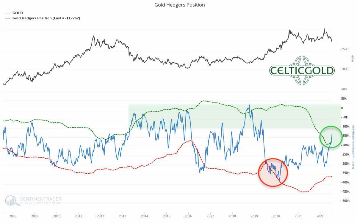 All in all, the daily chart has been bullish for a week now and still provides a buy signal. However, the way up is paved with strong resistances. Around $1,755 to $1,760 USD, an older downtrend line is waiting. Here also begins the well-known resistance zone between $1,750 and $1,785 USD. Even stronger resistance is likely to come from the downtrend line of the last three and a half months (currently around $1,800 USD and falling fast). Below $1,700 USD and especially below $1,680 USD, however, the sell-off continues. In that unlikely case, prices around $1,625 USD must be expected.Over the last four weeks, the cumulative net short position of the commercial market participants has dropped by another 66,307 contracts to "only" 112,262 gold contracts sold short. The commercial net short position is thus just slightly above the threshold of 100,000 short contracts, at which one can speak of a positive or bullish gold CoT report. In other words, professional market participants see less and less need to hedge against a falling gold price but are increasingly switching to the buy side due to the low gold prices.