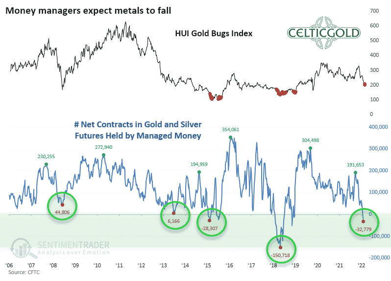 Not surprisingly, asset managers currently hold the lowest cumulative number of gold and silver futures contracts in their client portfolios since August 2018, and this is the second-lowest positioning in a long-term comparison over the past 16 years. This low allocation is evidence of a very negative expectation for precious metals prices.