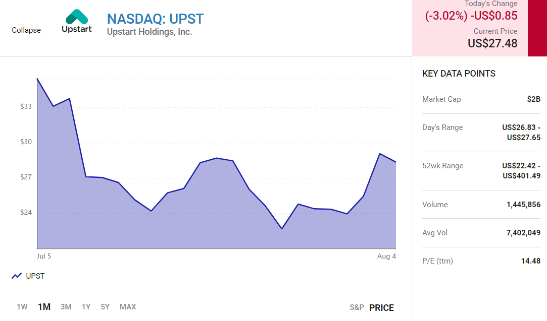 While a check of all the usual sources turned up no company-specific news that could be driving Upstart higher, the stock was likely moving in sympathy withSoFi Technologies(SOFI-1.94%), which reported better-than-expected financial results. In Q2, SoFi generated record net revenue of $362.5 million, up 57% year over year, and its adjustedEBITDAsoared 81%. This resulted in a loss per share of $0.12.