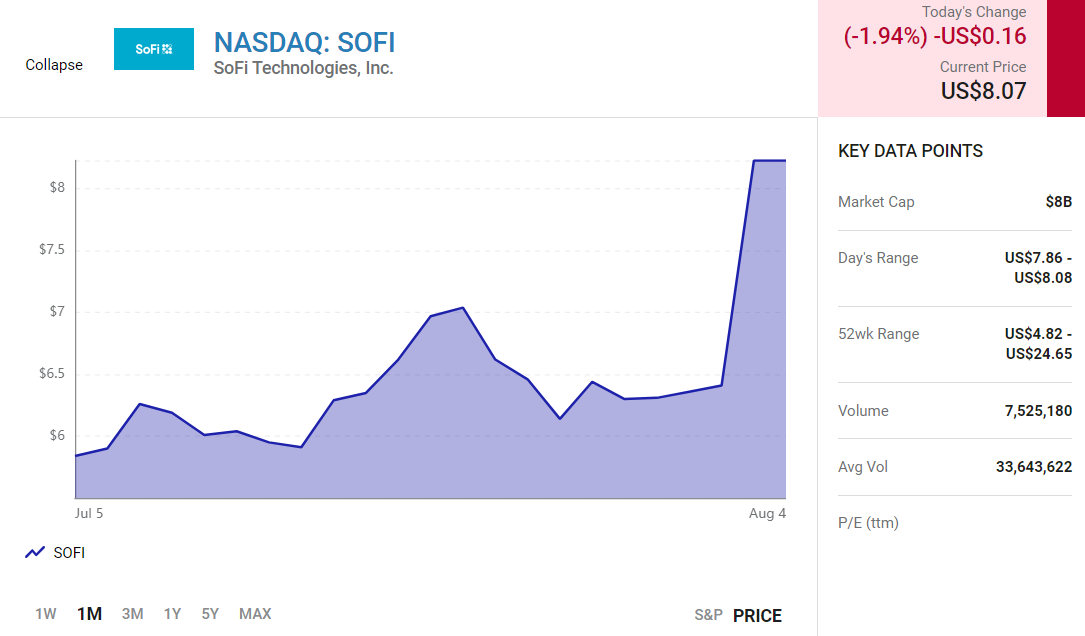 - The stock could be reacting to strong Q2 results from fellow fintech specialist SoFi Technologies.