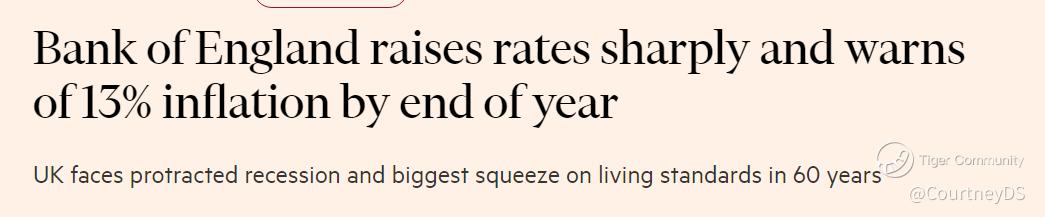 The Bank of England raise rate by the biggest amount in 27 years. They did it because they forecast that inflation will hit 13% by the end. They further forecast that the UK economy would slide into a 15 month recession later this year with GDP shrinking 2%.