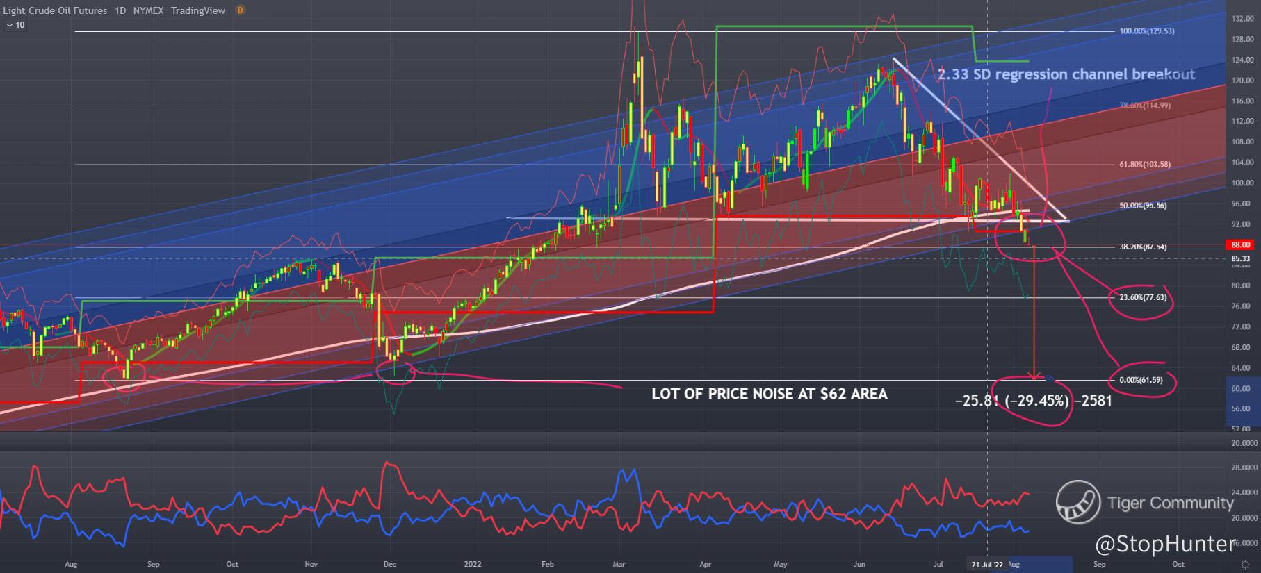 $Light Crude Oil - main 2208(CLmain)$$Micro WTI Crude Oil - main 2207(MCLmain)$ Looking to break long term fibonacci zone - key area to watch out for 88 USD area - if it can hold = more bullish. Is though breaking out down through longer term 2.33 SD regression channels to the south. If goes properly bearish, longer term downside targets: