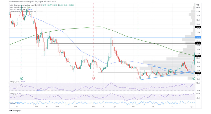 Update: AMC Entertainment stock kept rallying on Monday, adding 8.03% to settle at $23.96 per share. US indexes ended the day mixed, with the Dow Jones Industrial Average adding 28 points, but the S&P 500 and the Nasdaq Composite ended the day in the red, down 0.08% and 0.10%, respectively. Market players temporarily shrugged off concerns about an aggressive US Federal Reserve, spurred by a solid local employment report last Friday, ahead of the release of July inflation figures, to be out next Wednesday. Speculative interest hopes inflation eased from record highs and gives a breathe to stocks.