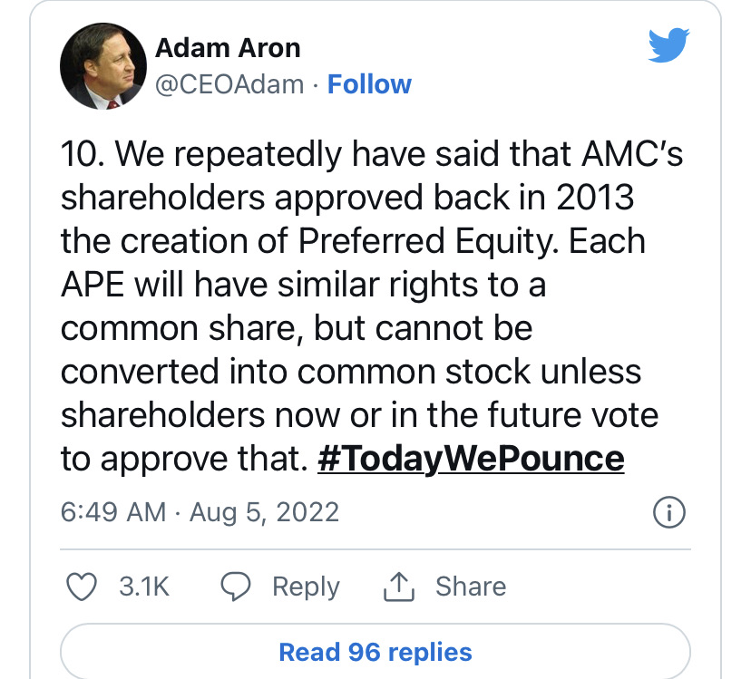 Ok, clear yet? AMC gave you a preferred unit with one voting right, but it also could issue 10 million preferred shares (different from preferred units). Each AMC preferred share carries 100 voting rights. So 10 million times 100 equals 1 billion voting rights. They are also convertible into 1 billion common stock. "Each share of Preferred Stock is initially convertible into one-hundred (100) shares of the Company’s Common Stock upon the terms described below." Now see what AMC CEO Adam Aron tweeted: