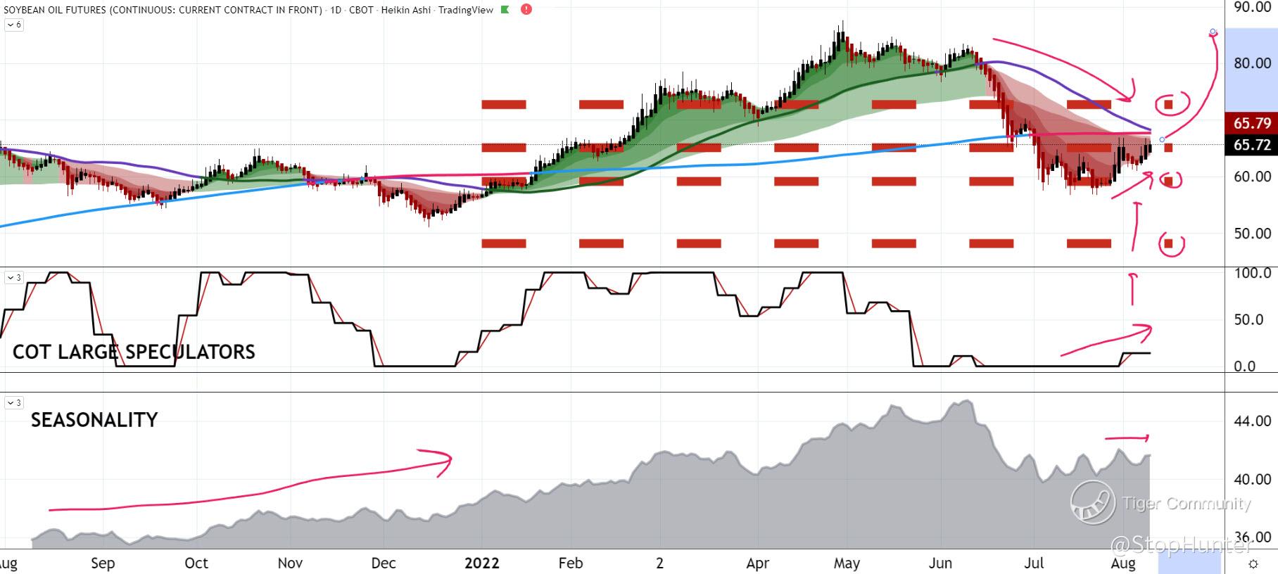 $Soybean Oil - main 2212(ZLmain)$futures - time to buy the dip? Starting to get into historical bullish seasonality zone, COT Large speculator data following price up which is what we want to see. Current POV - Bullish.
