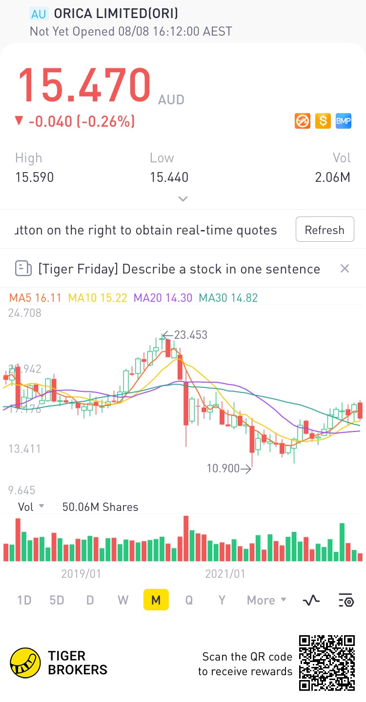 $ORICA LIMITED(ORI.AU)$After dealing with COVID impacts from the last two years, I'm expecting good things from this stock after the predicted steady commodity growth, particularly in gold, copper and quarry and construction in the second half #bullish