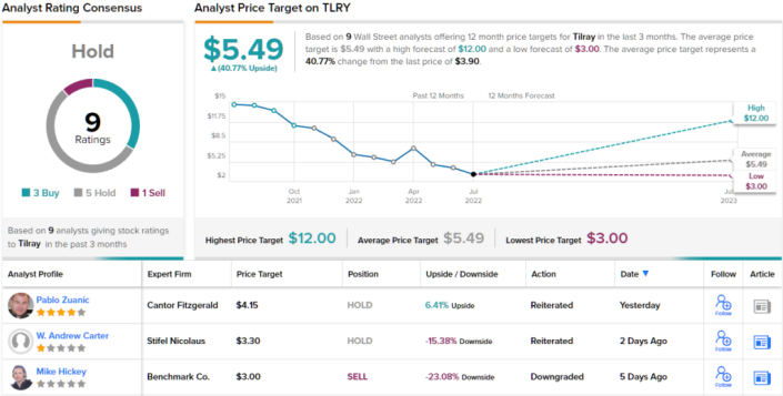 Most on the Street are not in Bennett's bullish corner when it comes to Tilray, with TipRanks analytics exhibiting the stock as a Hold. Based on 9 analysts polled over the last 3 months, 3 rate TLRY a Buy, 5 issue a Hold, while just one suggests a Sell.