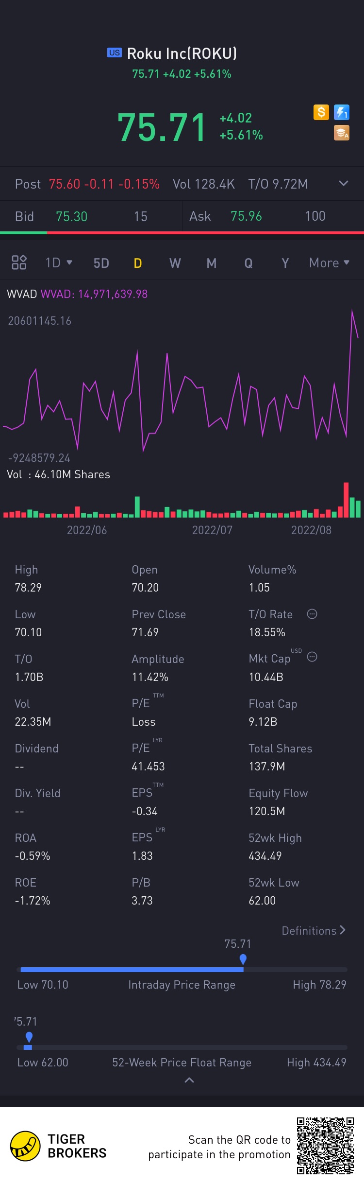 $Roku Inc(ROKU)$People were dumping around the 60 mark when analysts downgraded or gave bleak review after the earning report is out. Don't lead by fear and sway by such reviews. If you think it has potential and the right price, start a small investment