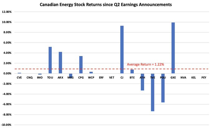 Canadian Energy stock returns since Q2 earnings announcements. The average return after the best quarter ever (for most companies) is about 1.2%.