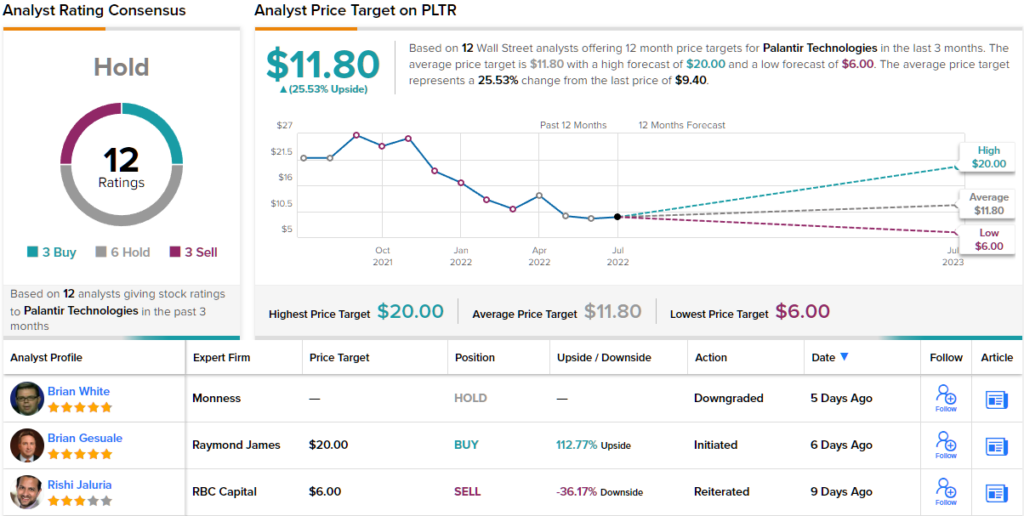 It’s mostly Holds amongst White’s colleagues too – 6, in total. The addition of 3 Buys and Sells, each, are not enough to move the needle and the stock claims a Hold consensus rating. The forecast calls for 12-month gains of ~26%, considering the average price target clocks in at $11.80. (See Palantir stock forecast on TipRanks)