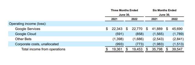Cloud has the potential to become a true behemoth and cash cow for Google, with a growth rate roughly three times that of search. In the second quarter, sales were $6.3 billion, but the division is still not profitable for Google. This is expected to change once Google approaches critical mass and segment economics improve. Google Services generated a $22.3 billion operational profit for Google, and the business has been profitable for the corporation on a constant basis.