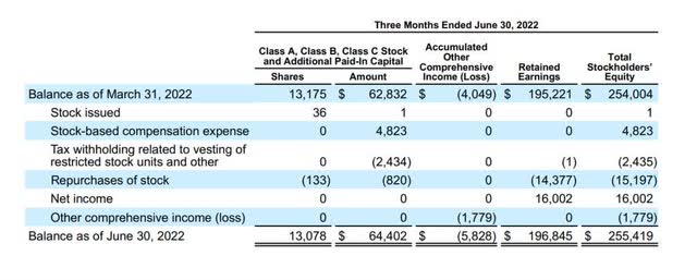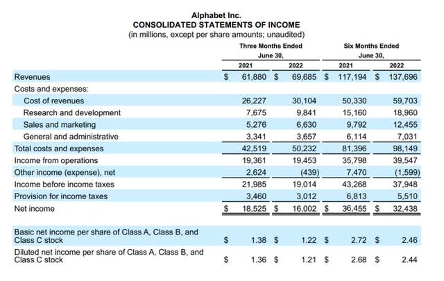 Google's profits for the fiscal quarter ended June 30, 2022 were $16.0 billion, or $1.22 per share, a 12% decrease YoY. Even if profits fell $2.5 billion YoY due to slower growth and increased expenses, I find it difficult to blame Google given that $16.0 billion in profits is a pretty figure. The majority of this money will also be allocated to shareholders.