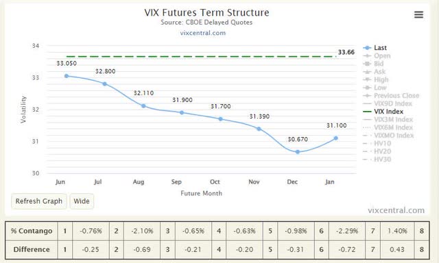 One popular VIX ETF product investors can use is the ProShares Ultra VIX Short-Term Futures ETF (BATS:UVXY). This investment vehicle, asdescribedby the well-known ETF issuer ProShares, "seeks daily investment results, before fees and expenses, that correspond to one and one-half times (1.5x) the daily performance of the S&P 500 VIX Short-Term Futures Index". This essentially means in theory the fund is designed to generate 1.5x times the returns of the VIX. However, since the VIX futures curve is typically incontango, ProShares needs to constantly roll its short-term futures contracts to the next month at a higher price than where the VIX currently trades. This is why typically UVXY trades negatively in the long run despite the VIX index being higher over the last few years. However, since the VIX futures curve has been in backwardation recently, I believe UVXY has become overpriced. When the VIX returns back to its normal futures curve, UVXY will likely decline considerably as it will become more expensive to roll its short-term futures contracts.