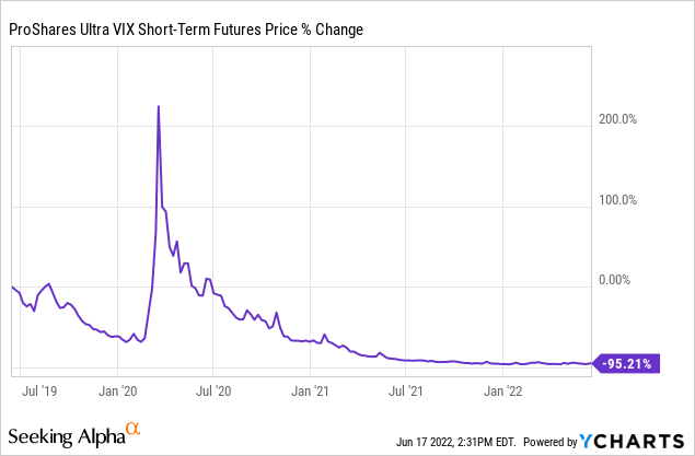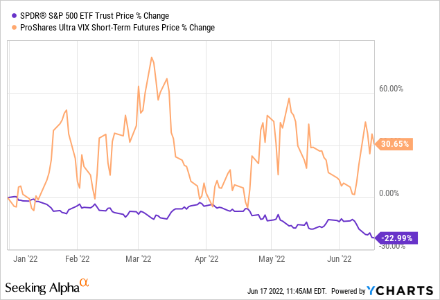 Unsurprisingly, funds such as UVXY have benefited in the near term from a combination of lower short-term futures prices and heightened market fears. As of mid-June, UVXY was up more than 30% YTD while the S&P 500 was down nearly 23%.