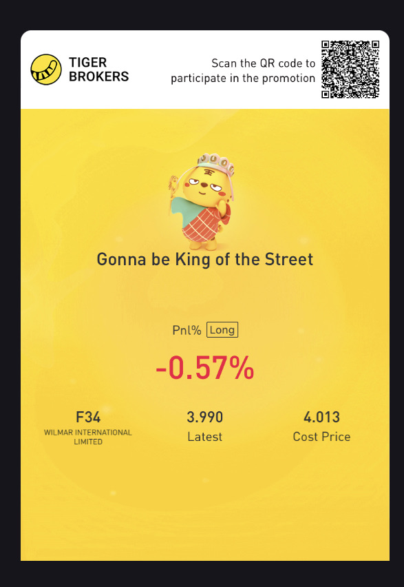 On the long term of course i wish the stock price appreciate too [Happy] so today i bought $WILMAR INTERNATIONAL LIMITED(F34.SI)$I saw the price dip near yo 52weeks low, in my watch list for long time but did not dare to enter, just like go 🛍 i only window shopping [Gosh] too afraid to take the risk, but today I decided to buy, waiting for dividend in August [Smile]