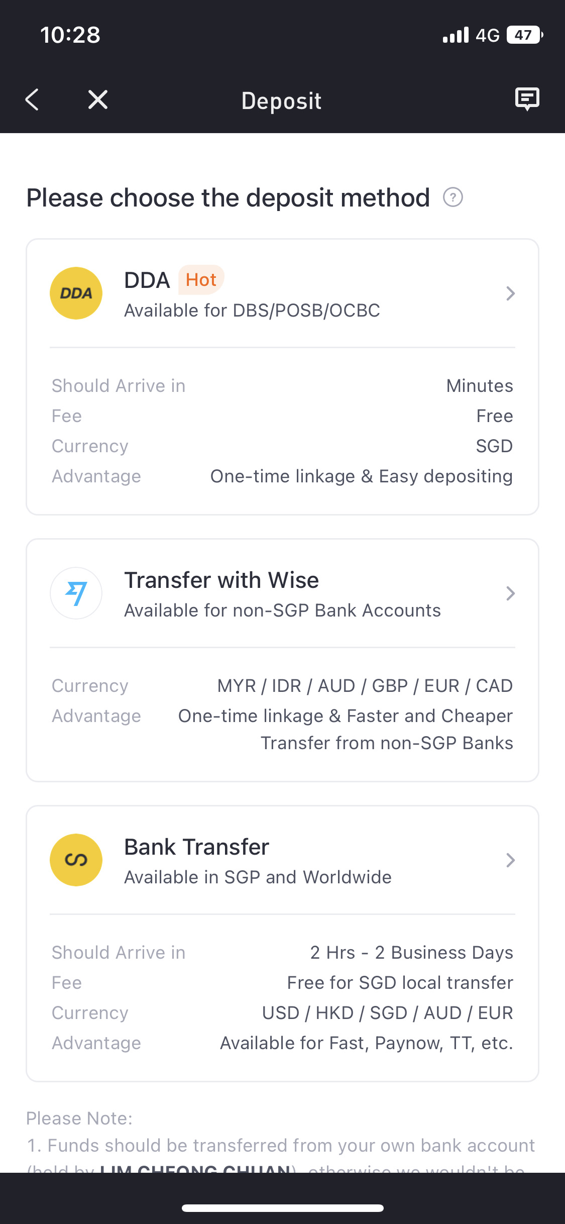 Deposit page is a one stop place to deposit cash into Tiger. Options such as DDA is almost instant (max 15 mins) to get yr cash intoTiger. Well done Tiger.