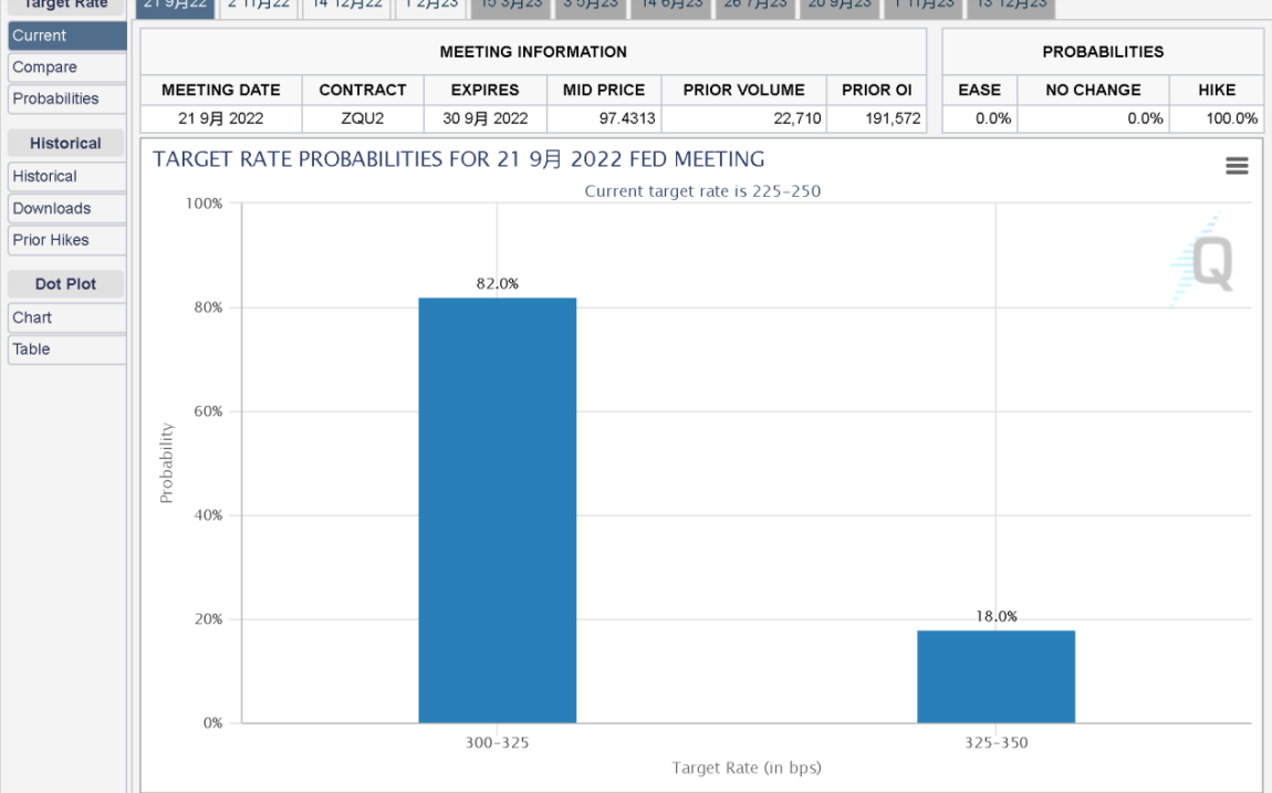 Raise interest rates by 75 basis points in September, continue to raise interest rates by 75 basis points in November, and then raise interest rates by 50 basis points in December. The annual interest rate center reaches 4%, which is the expected path of the current market. Anyway, after the mid-term elections, there will be less political pressure for the Fed to raise interest rates sharply, which may bring important respite (rebound) opportunities for the market.