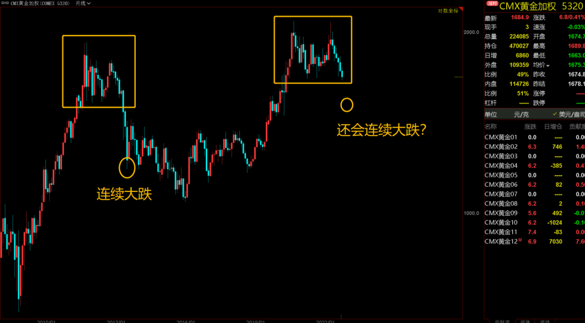 Technically, after the gold price broke last week, although it is still on the edge of a large range in theory, as the Chinese saying goes, "There are only three things", and the result of bottoming out again usually breaks through downward, so I am not optimistic about the price of gold, and it may accelerate.After the gold saw a big peak in 2011, the bottoming was a continuous sharp drop, so be careful when bargain-hunting.