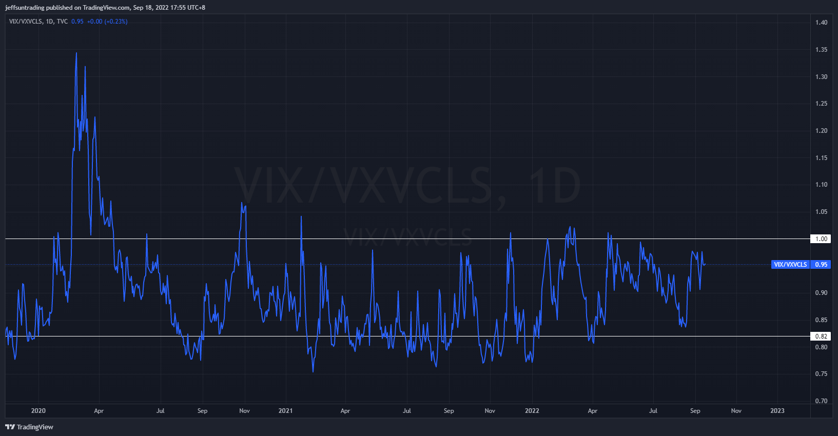 The VIX/VXV measures the ratio between 1-month implied volatility and 3-month implied volatility, which is helpful as it filters out higher baseline readings on VIX.