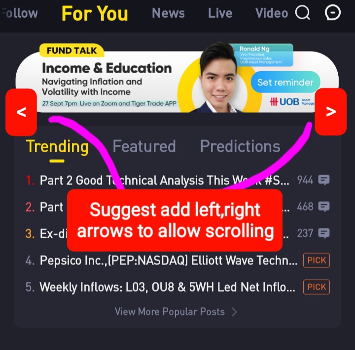 For Community > For You : suggest that for the Top Banner (showing promo etc), Left arrows and Right arrows can be displayed to allow users to scroll through the Banner.