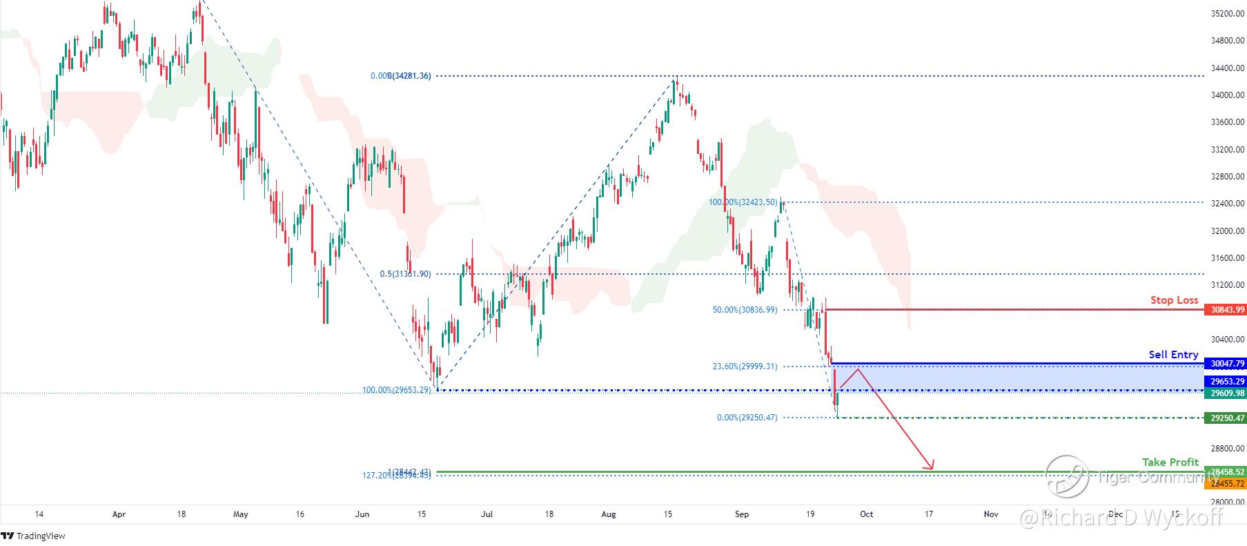 3.)I am looking for the price to do a retracement back up towards the 23.6% Fibonacci retracement line for a sell entry at 30047.79.
