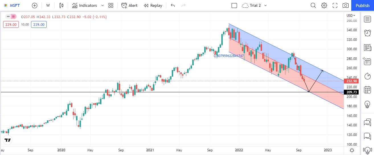 $Microsoft(MSFT)$Is this a possible scenario for MSFT? Drop to about 210 and bounce back from bottom of channel.