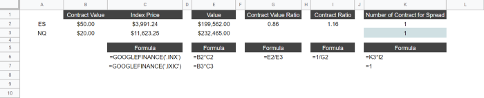 In the above screenshot, we calculate the contract number for each leg according to their contract value. The only thing that we need to define is the number in the blue box. If we are going to buy 1 NQ contract, then we need 1 ES contract to balance it. For 10 NQ contracts, 12 ES contracts will be more suitable.
