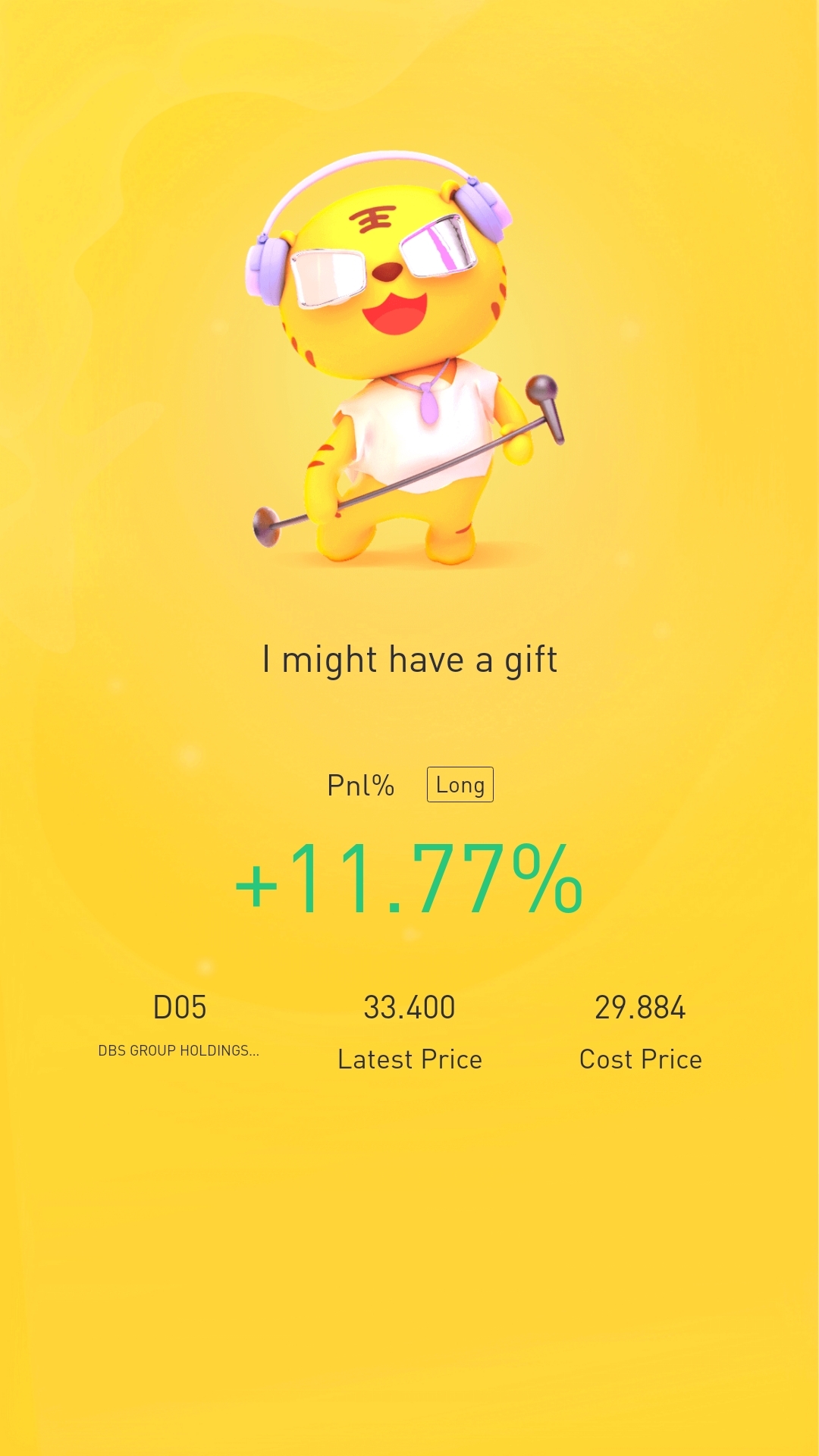 $DBS GROUP HOLDINGS LTD(D05.SI)$is my best gain this year in Tiger Broker though my biggest one is the $JARDINE CYCLE & CARRIAGE LTD(C07.SI)$(20% of my portfolio but in the other broker)