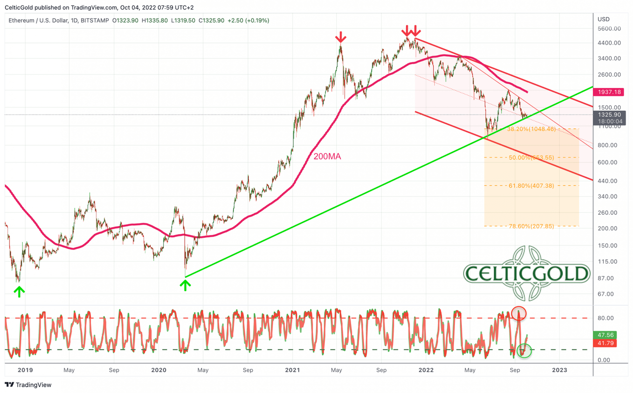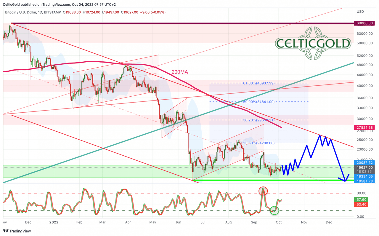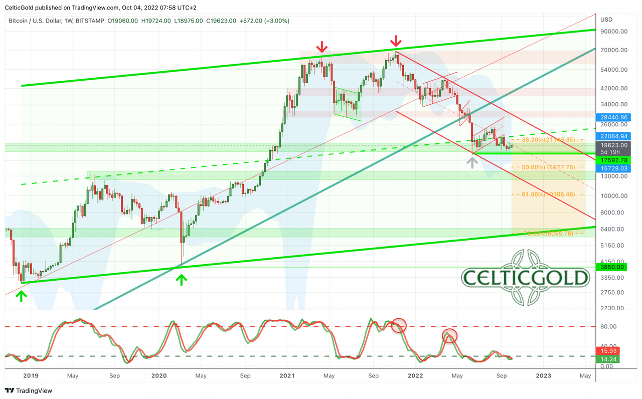 Until now, however, the U.S. Dollar is not yet confirming a reversal. As long as the greenback remains strong and trending higher, the liquidity crisis will continue and all asset classes will remain under pressure. For Bitcoin, the support in the area around 18,000 USD is at stake. Should the bears be able to prevail, prices will likely correct further towards 14,000 USD and 10,000 USD. Our worst case scenario remains 6,000 USD in the medium term. However, we suspect that there will be a sharp recovery rally in all markets. It might have started already or will start somewhere between mid and end of October. This will postpone the final sell-off until next year.