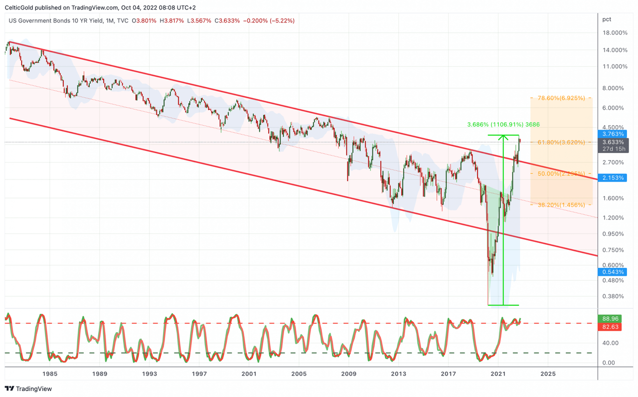 Stress in the financial markets has been steadily increasing for months. The main driver are the bond markets. Here, the nominal yield on 10-year U.S. government bonds (SPUSTN) has increased more than tenfold from 0.33% to 3.83% in just two and a half years!