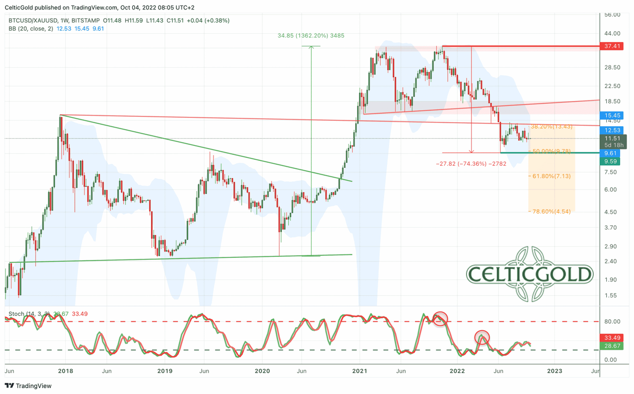 Although there was a temporary rise in favor of Bitcoin in midsummer, ultimately the ratio has been consolidating the previous sell-off for three and a half months between 9.5 and 13.5. Given the oversold situation in combination with the active stochastic buy signal on the weekly chart, the chances for a recovery in the coming weeks are not that bad.