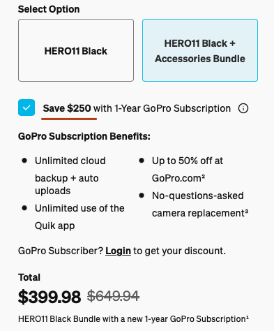 More specifically, customers can save $150 and $250 by signing up for the 1-year subscription when buying the Hero 11 edition or Bundle pack, respectively. Regardless, GoPro's strategy is to lock in users in the subscription platform to familiarize themselves with the GoPro Quik app/desktop and create a habit so that they stick to the service for a longer term.Thus, a user cost-and-benefit analysis is the only way to predict the service's success. The annual renewal cost stands at $49.99 or $4.17 per month, and users get the following top features: