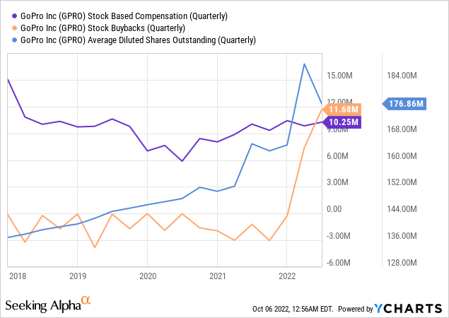 In Q2 2022, GPRO SBC stood at $10.25 million for the quarter, but a buyback of $11.76 million more than countered the dilution. Moreover, in the first half of 2022, GoPro's SBC reached at $20.08 million, and the company repurchased common stock with $21.76 million. Hence, it is reasonable to argue that the risk of dilution through SBC to existing shareholders is minimal at the moment.