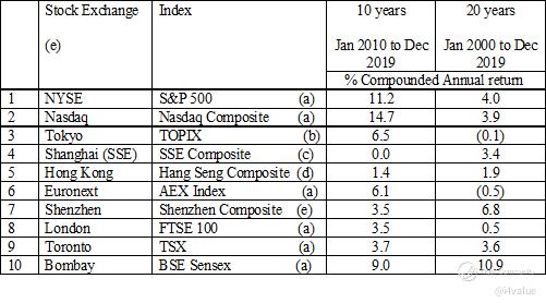 If you are investing as a long term activity, you have to be realistic about your returns. The chart below shows the index returns for the top 10 stock exchanges around the world. You can see that the returns vary not just on the holding period, but also where you invest.